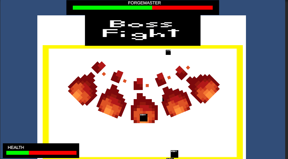 This is the first devlog of my newest project, "Meet Your Maker!". This was originally created as a project for a class gamejam, and I was inspired by our theme: Forge, to make a game where you'd fight a powerful being that itself was a forge, and would combat the player with blasts of heat, molten metal, and crafting lesser warriors to combat you, the player. After the assignment was done however, I was really inspired and decided to continue working on this. There isn't much art yet, as I prioritized creating the mechanics and code during the time we were given, and I intend on improving that aspect in the future.